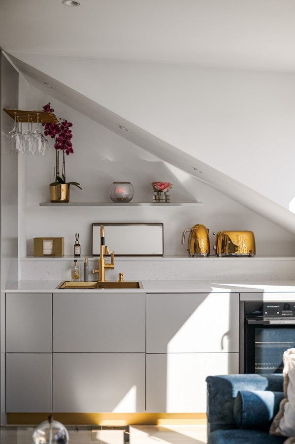 Arbetsytorna är generöst tilltagna med djup bänkskiva i komposit om ca 90 cm, vilket ger mycket god funktionalitet och arbetskomfort. Köket är utrustat med två infällda diskhoar i mässing med exklusiva blandare från Tapwell, vilket ger ett tydligt premiumuttryck och hög kvalitet i varje detalj.
