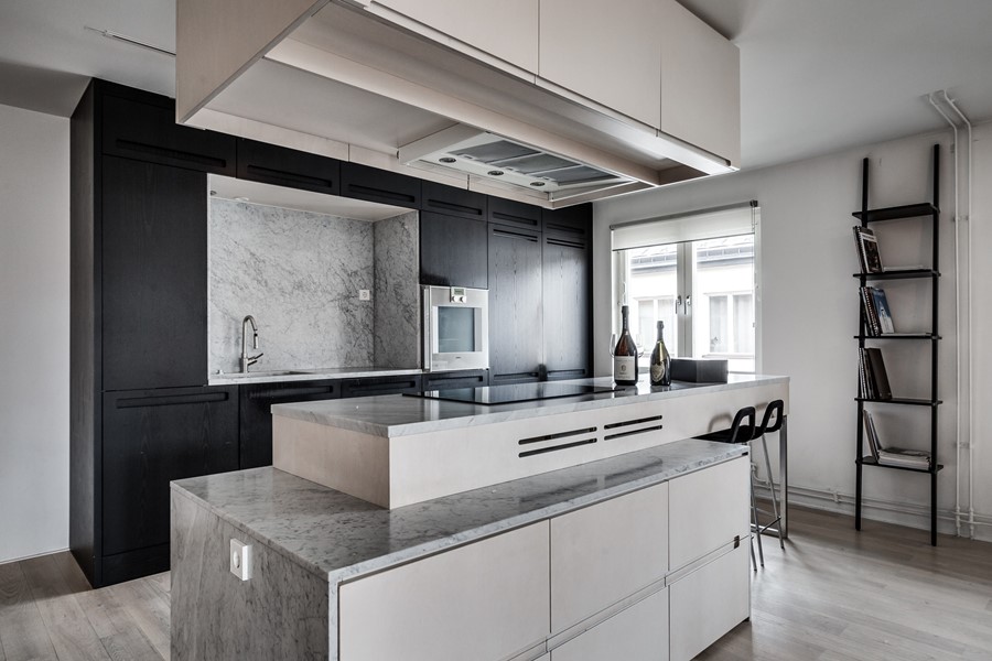 KONTAKTA SIMA LANNHILL FÖR PRIVAT VISNING! Våningen är mycket grundligt planerad och byggd i mycket modernt utförande, med avsikt att ge en arkitektonisk känsla av enhetlighet. Lägenheten är nästintill tröskelfri och byggd med så karmfria dörr och inredingslösningar som möjligt. Både tak och golv är genomgående i nästan hela lägenheten. Hela lägenheten omgärdas av platsbyggd inredning/förvaring, platsbyggda dörrar och paneler för att förstärka känslan av en ett enda stort rum. Med få undantag är all inredning och garderober byggda med massiva material vilket ger lådor och dörrar en exklusiv och unik känsla.