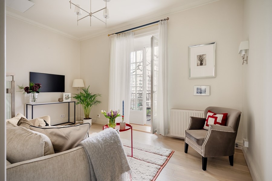 I en vacker fastighet från 1912 på eftertraktade Karlbergsvägen finns denna exceptionella trerummare i två etage, belägen i ett tyst och lummig innergård. Bostaden erbjuder en sällsynt townhouse-känsla med två separata entréer och direkt utgång till grönska – som en egen oas mitt i stan.